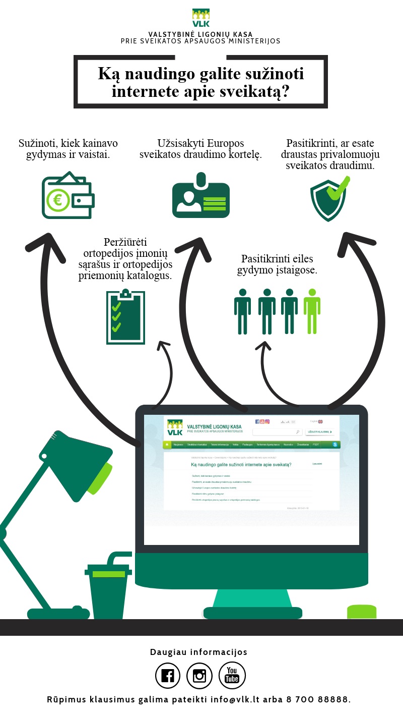 Kreipiatės į įvairias institucijas, kad darbuotojai patikrintų, ar esate draustas privalomuoju sveikatos draudimu? Laukiate eilėse, kad užsisakytumėte Europos sveikatos draudimo kortelę (ESDK)? Skambinate į gydymo įstaigas, norėdami sužinoti, kurioje iš jų yra trumpiausia eilė pas gydytoją specialistą? To tikrai nebereikia daryti – visas šias ir dar daugiau paslaugų Valstybinė ligonių kasa prie Sveikatos apsaugos ministerijos (VLK) yra perkėlusi į elektroninę erdvę. Taigi daugelį su jūsų sveikata susijusių naudingų dalykų galite sužinoti tiesiog vienu mygtuko paspaudimu, nė neišeidami iš namų.