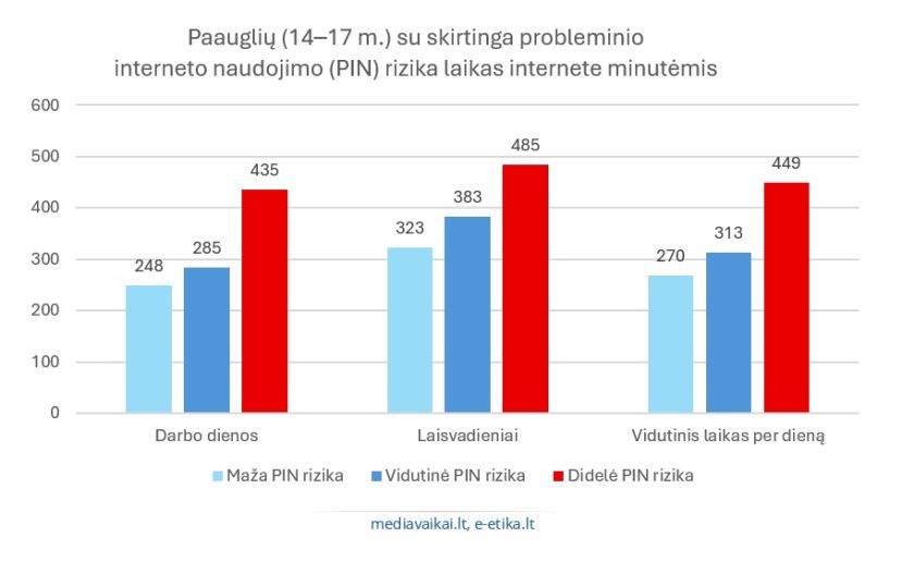 Laiko trukmė internete, tam tikros veiklos jame, emociniai sunkumai, tokie kaip nerimas ir depresija, yra susiję su aukštesne probleminio interneto naudojimo rizika, rodo vaikų ir paauglių imties tyrimo duomenys. 14–17 m. Lietuvos paaugliai internete mokyklos dienomis praleidžia vidutiniškai 4,5 val., o laisvadieniais – beveik 6 val. Trečdalis paauglių (29 proc.) internete laisvadieniais būna nuo 5 iki 6 val., o kas penktas (22 proc.) – kone visą „darbo dieną“ – 7–8 val.