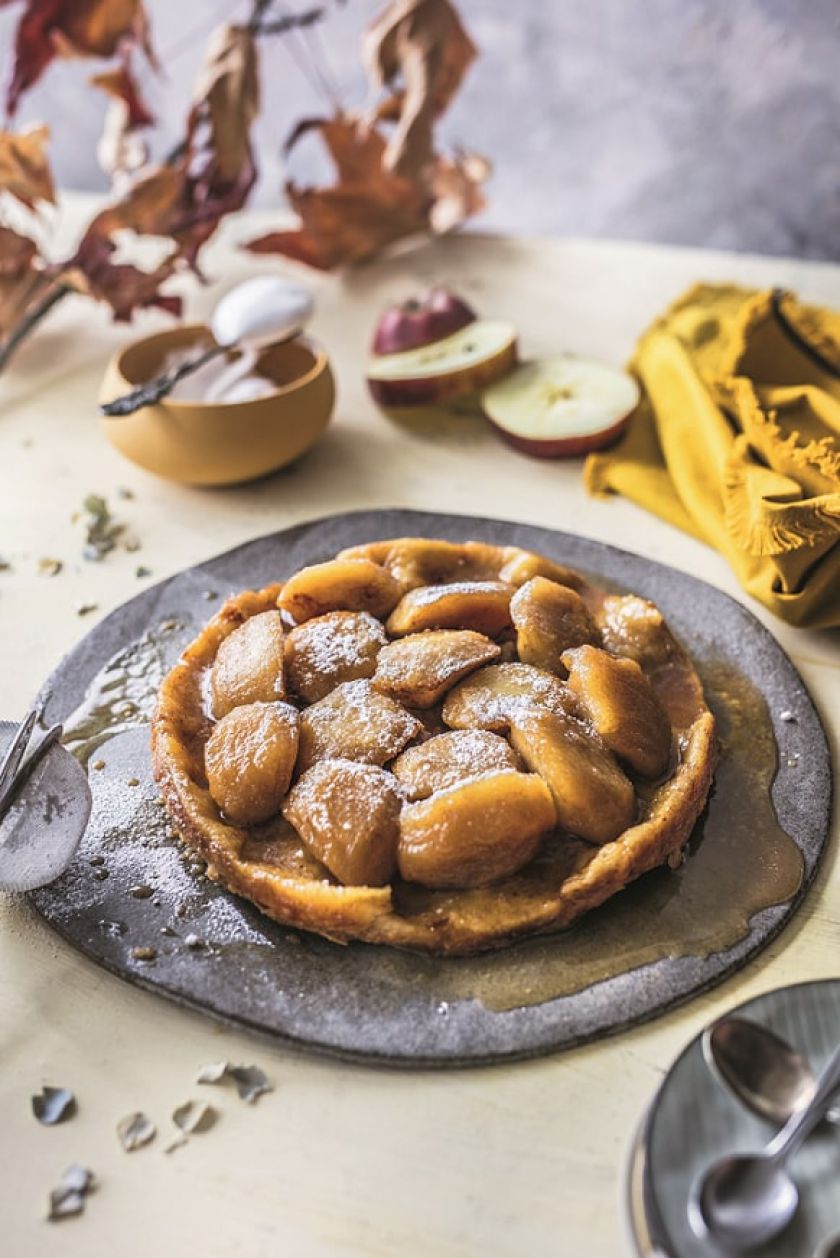 Į didelį dubenį suberkite miltus, dėkite šaltą kubeliais supjaustytą sviestą ir pirštų galiukais įtrinkite sviestą į miltus. Kai viskas sulips, į masę suberkite cukraus pudrą, druską, sudėkite kiaušinių trynius, grietinę bei supilkite vandenį. Minkykite tešlą, kol ingredientai susimaišys, tuomet suformuokite rutulį, suvyniokite jį į maistinę plėvelę ir palikite šaldytuve 20 minučių. Kol tešla vėsta, įkaitinkite orkaitę iki 180 laipsnių ir paruoškite obuolius. Nuplaukite juos, nulupkite, padalinkite į 4 dalis ir pašalinkite sėklytes. Didelėje keptuvėje išlydykite sviestą bei cukrų ir suberkite obuolius. Keptuvės turinį išmaišykite, apibarstykite cinamonu, užliekite citrinos sultimis ir kepkite 5 minutes, kol obuoliai karamelizuosis. Nukelkite keptuvę nuo kaitros ir, pagardinę obuolius vanilės ekstraktu, dar kartą viską gerai išmaišykite. Obuolius su sirupu sudėkite į kepimo formą taip, kad apvalioji obuolių dalis būtų apačioje. Obuolius atsargiai užklokite iškočiota atšalusia tešla ir pašaukite į orkaitę. Kepkite 30-40 minučių. Kai pyragas iškeps, ištraukite jį iš orkaitės ir palikite atvėsti maždaug 30 minučių. Kepimo formą uždenkite didele lėkšte ir viską apverskite, kad pyragas liktų lėkštėje. Tai darydami naudokite virtuvinį rankšluostį ar puodkėlę, nes kepimo forma vis dar bus labai karšta.
