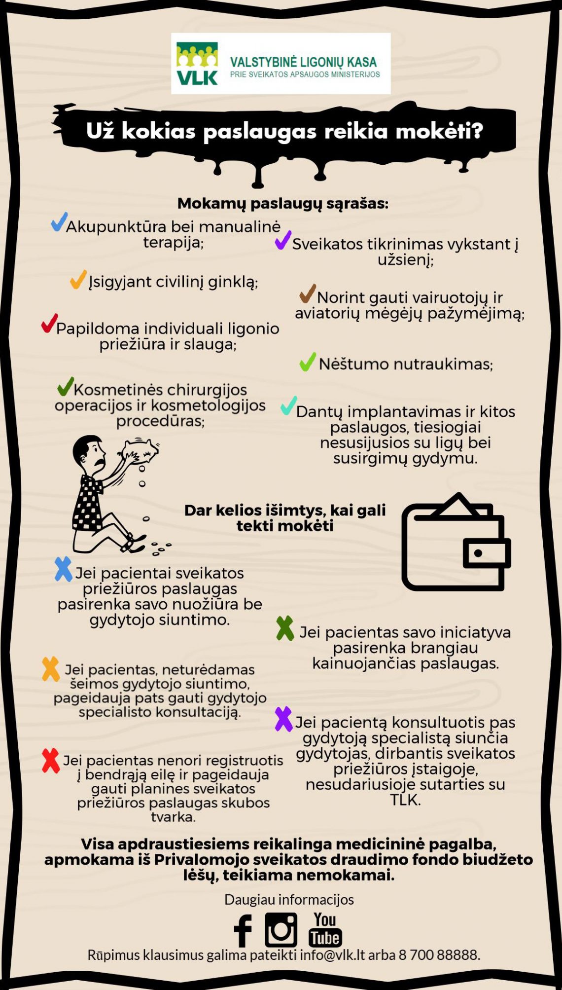 Svarbu žinoti, kad su TLK sudariusi sutartį sveikatos priežiūros įstaiga privalo informuoti pacientus apie galimybę nemokamai gauti ligonių kasų lėšomis apmokamas sveikatos priežiūros paslaugas. Jei gydymo įstaigoje paprašoma susimokėti ar primokėti už gydymo paslaugas, pirmiausia būtina išsiaiškinti, kodėl to reikalaujama. Specialistai primena, kad šiuos klausimus pirmiausia reikėtų aiškintis gydymo įstaigoje – jei negaunate atsakymo iš gydančio gydytojo, būtina kreiptis į administraciją. O jeigu pateikti atsakymai ar argumentai neįtikina, prieš mokant už paslaugas ar vaistus, patartina pasikonsultuoti su TLK gyventojų aptarnavimo skyriaus darbuotojais.