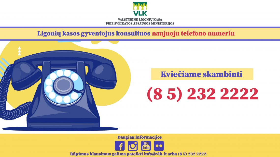 Ligonių kasos nuo gruodžio 1 dienos gyventojus konsultuos naujuoju telefonu numeriu – (8 5) 232 2222, pranešė Valstybinė ligonių kasa prie Sveikatos apsaugos ministerijos (VLK).