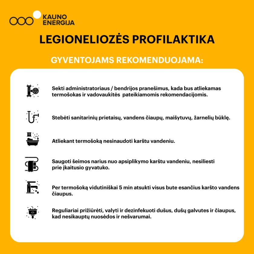Centralizuotai miesto šilumą ir karštą vandenį Kauno mieste ir rajone bei Jurbarke tiekianti bendrovė „Kauno energija“ nuo balandžio 15 d. 00.00 val. iki balandžio 17 d. 00.00 val. termofikacinio vandens temperatūrą padidins iki 80 °C, kad pastatų karšto vandens sistemų prižiūrėtojai arba administratoriai galėtų atlikti terminę legioneliozės prevenciją – terminę dezinfekciją (termošoką). Atlikus legioneliozės profilaktiką ir pasibaigus šildymo sezonui prasidės hidrauliniai miesto šilumos tinklo bandymai. Jų metu vamzdynuose sukeliamas didelis slėgis, siekiant aptikti defektus, todėl pastatams laikinai stabdomas termofikacinio vandens, kuris yra naudojamas karšto vandens ruošimui, tiekimas. Kada ir kiek laiko karšto vandens nebus pastate, vartotojai patogiai gali sužinoti „Kauno energijos“ internetinėje svetainėje: www.kaunoenergija.lt/hidrauliniai-bandymai-ir-planiniai-remontai, tereikia įvesti savo namo adresą. Informaciją apie…
