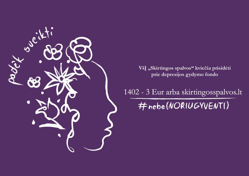 Socialinė iniciatyva „Skirtingos Spalvos“ iki vasario 29 d. kviečianti visuomenę prisidėti prie labdaros fondo depresijai gydyti #nebe(NORIUGYVENTI) pristato atvirą pokalbį su garsia aktore Gelmine Glemžaite. Žymi moteris ragina visuomenę prisijungti prie labdaros fondo įgyvendinimo, taip dalindamasi prisiminimais apie vieną iš sunkiausių savo gyvenimo etapų, išgirstą bipolinio sutrikimo diagnozę, patirtis ligoninėje ir norą pasitraukti iš gyvenimo. Prie labdaros fondo žmonės kviečiami prisidėti skambindami trumpuoju numeriu 1402 ir skirdami 3 Eur auką arba didesnę auką skirdami interneto svetainėje: www.skirtingosspalvos.lt. Deja, bet kartais taip nutinka, kad į žmonių gyvenimus ateina tas momentas, kai žmogus turi išgyventi gyvenimą ir susiduria su savižudybės būsena. Anot socialinės iniciatyvos „Skirtingos Spalvos“ įkūrėjo Daliaus Stankevičiaus, būtent todėl labdaros…