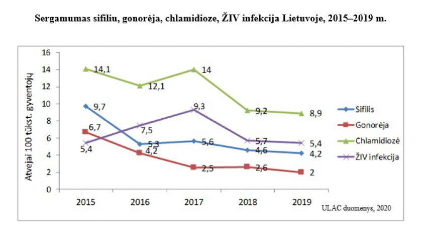 Sergamumo 100 tūkst. gyventojų rodiklis Lietuvoje 2019 metais chlamidioze siekė – 8,9 atvejo, sifiliu – 4,2 atvejo ir gonorėja – 2 atvejus. Visi pastarieji rodikliai 2018 m. buvo nežymiai didesni.