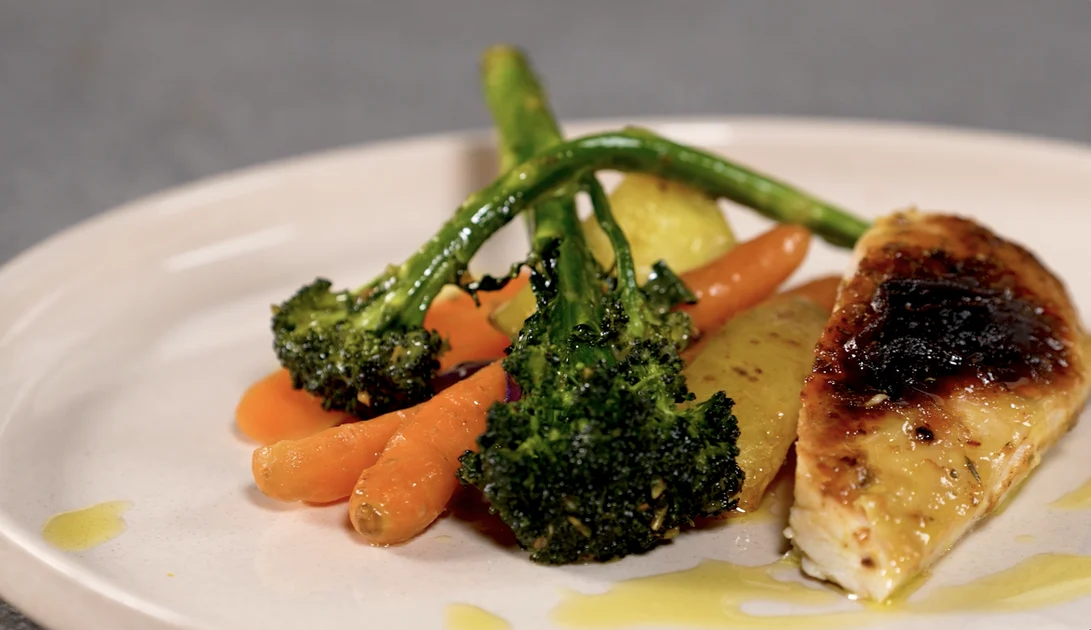 Likus kelioms minutėms iki kepimo pabaigos į skardą sudėkite brokolių ūglius, kad jie išliktų traškūs ir neperkeptų. Iškepus viščiuką neskubėkite jo pjaustyti – leiskite kelias minutes pailsėti, kad sultys pasiskirstytų mėsos viduje. Tuomet supjaustykite porcijomis ir patiekite su keptomis daržovėmis.