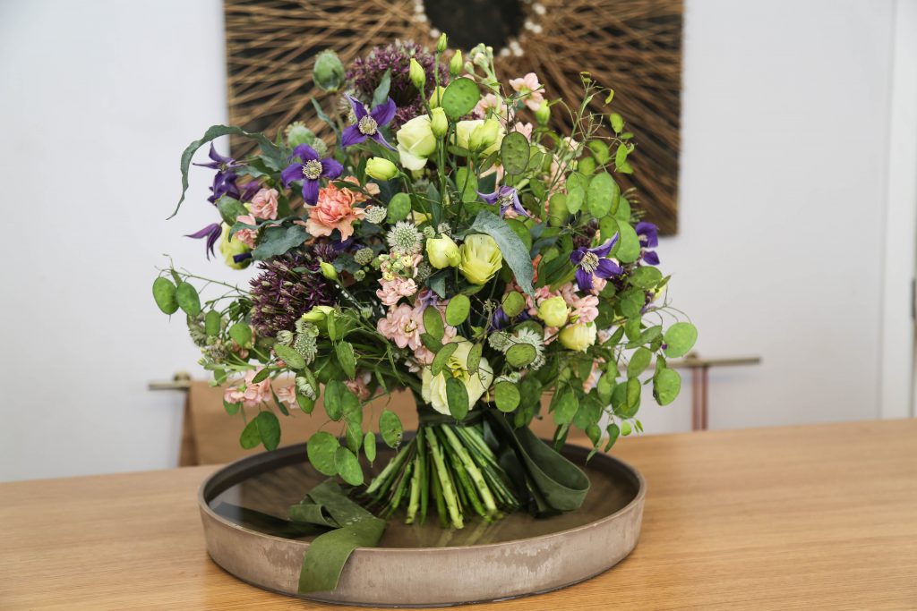 Floristė Evelina teigia, jog tokią puokštę galėtų išmokti pasidaryti kiekvienas ir video pamokoje praktiškai demonstruoja visą kūrimo eigą. Puokštės kūrimui buvo naudotas dekoratyvinis česnakas, leukonijos, aguonos, darželinė blizgė, gvazdikai, eustomos, raganės, papartis, astrancijos.