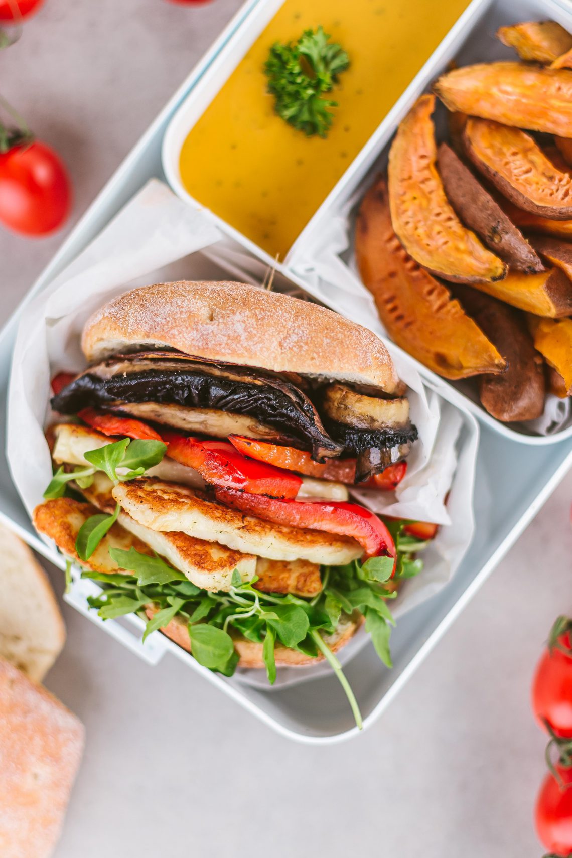 2 valgytojams reikės:kefyrinių porcijinių 2 duonelių, 2 Portobelo grybų arba saujos prievagrybių, 200 ghalloumi sūrio, pusės paprikos, didelės saujos mėgstamų salotų ar žolelių, 2-3 batatų, žiupsnelio druskos ir pipirų pagal skonį, šlakelio alyvuogių aliejaus, mėgstamų padažų (pavyzdžiui, pesto ir pomidorų).