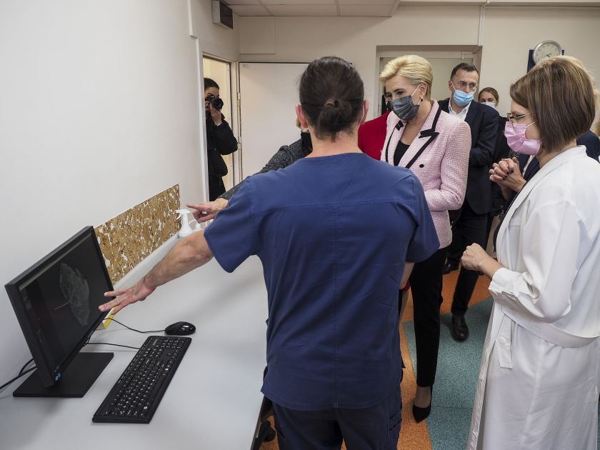 Lietuvos ir Lenkijos pirmosios ponios lankėsi NVI Diagnostinės ir intervencinės radiologijos skyriuje, kur skyriaus vedėja, gydytoja radiologė dr. Jurgita Ušinskienė ir gydytojas radiologas dr. Mantas Trakymas pasakojo apie krūties vėžio diagnostiką ir abliacines procedūras. Dr. J. Ušinskienė pristatė skyriuje dirbančių medikų komandą, paaiškino Krūties vėžio diagnostikos centro veiklos principus, parodė profilaktinei patikrai atvykstančių pacienčių kelią. „Tiriant krūtis dėl vėžio per metus skyriuje padarome apie 10 tūkst. profilaktinių mamogramų, apie 30 tūkst. ultragarso procedūrų, daugiau nei 1000 biopsijų, apie 10 kompiuterinės tomografijos tyrimų per savaitę, 50 magnetinio rezonanso tyrimų per mėnesį,“ – apie skyriaus veiklą pasakojo dr. J. Ušinskienė.