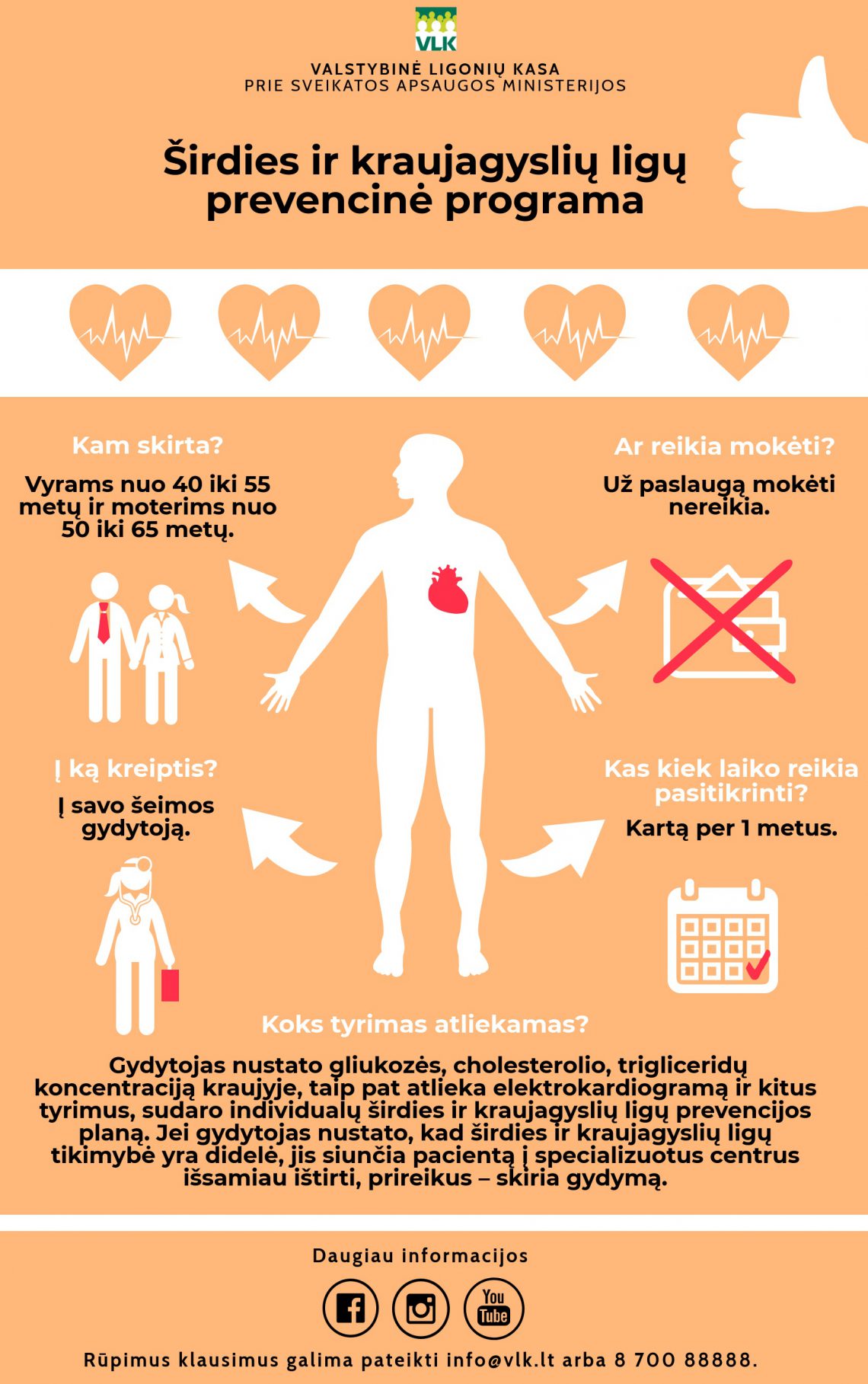 Pagal Lietuvoje vykdomą širdies ir kraujagyslių ligų prevencijos programą kartą per metus moterys nuo 50 iki 65 metų ir vyrai nuo 40 iki 55 metų kviečiami pasitikrinti sveikatą. PSD apdraustiems žmonėms už sveikatos patikrinimą pagal šią prevencinę programą mokėti nereikia, nes už šias paslaugas sumokama Privalomojo sveikatos draudimo fondo (PSDF) biudžeto lėšomis.