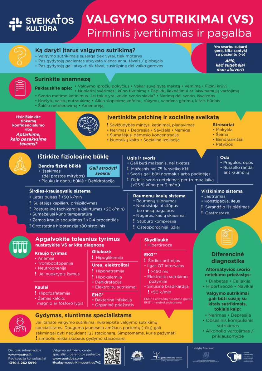 Suprasdami savalaikio diagnozavimo svarbą, Vilniaus miesto psichikos sveikatos centro Valgymo sutrikimų centro specialistai parengė ir išleido išsamų plakatą „Valgymo sutrikimai (VS). Pirminis įvertinimas ir pagalba“. Jame atkreipiamas dėmesys į pagrindinius valgymo sutrikimų simptomus ir rodiklius, nurodoma, kada reikalinga stacionari pagalba, o kada užtenka psichiatro ar psichologo ambulatorinių konsultacijų.