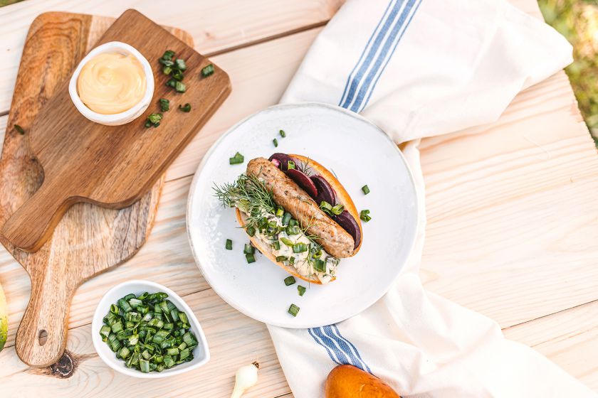 - Į bandelę dėkite dešrelę bei pjaustytus marinuotus burokėlius. Ant viršaus – dosniai paskirstykite kiaušinių mišrainę, viską pagardinkite smulkintais krapais ir svogūnų laiškais.